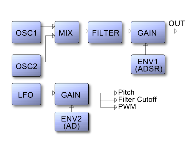 - OSC x 2 + Filter x 1 + EG x 2 (ADSR + AD)