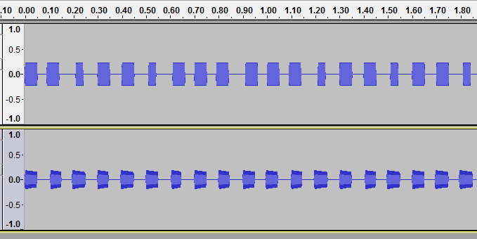 下の図は上段が今の所未対策のWebBeeper、下段が補正対策済みのGMPlayerで BPM150の16分つまり0.1秒周期の音。上段は見ただけでもかなりひどい感じだけど、下段はまあそれなりになっている。