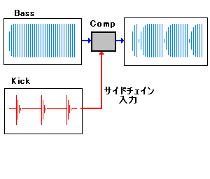 典型的には、ベースにかけるコンプレッサーをキックでトリガーする、という風に使う。この例ではキックが鳴る瞬間だけ音量が絞られ、単調に鳴っているベースにキックの音に同期したビートを与えるような効果となる