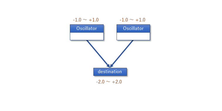 つまり、.value が 440 の時、connect() による接続から (-10 ~ +10) の大きさの信号が入ってくるとすると、オシレータの周波数は (430 ~ 450)Hz の範囲でビブラートがかかります。