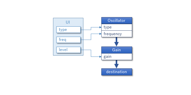 ノードの接続は osc => gain => destination となっていて、type と freq は osc を、level は gain をコントロールします。