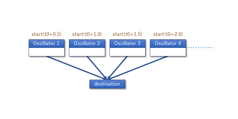 下の例では Setup() が呼ばれた時にあらかじめ必要なオシレータと時刻を設定してしまいます。0.5秒ごとに0.1秒の長さの音を出すオシレータを10個作っています。基準となる時刻はSetup()が呼ばれた時の時刻 t0 で常にここからの計算になっている事が重要です。