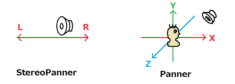 これを実現するために Web Audio API では左右の位置を決めるだけの StereoPanner と 三次元空間内の位置関係を決める Panner という2種類のノードが準備されています。