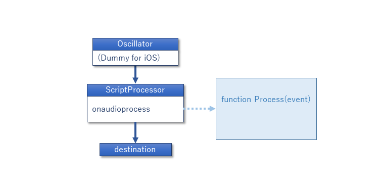 ノードの接続としては ScriptProcessor を作って destination に繋いでいます。スクリプトプロセッサーの onaudioprocess プロパティ に Javascript の関数を指定すると必要に応じて関数がコールバックされますのでその中で音声データを直接出力バッファに書き込みます。